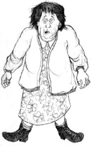 Standing before me is a Quentin Blake caricature sprung from Roald Dahl’s mind. Atop her head, a dusty wig clings like a sickly rodent. The breadth of her shoulders must  require her to pass sideways through doors. Without greeting me, she begins scanning my items and batting them down the belt. BOINK! BOFF! As my bananas bounce by, she pins me with a glare to indicate that she has finished. I hand her my card. When she returns it with the receipt I smile and venture a “thank you.” The cashier pauses, taking my measure, and then gives a guttural response that does not involve lip movement. Maybe I have cheered her with my courtesy and perhaps she feel bad about her grumpiness, because as I wheel away she tosses me one friendly tidbit–she does not tell me to have a great day.
